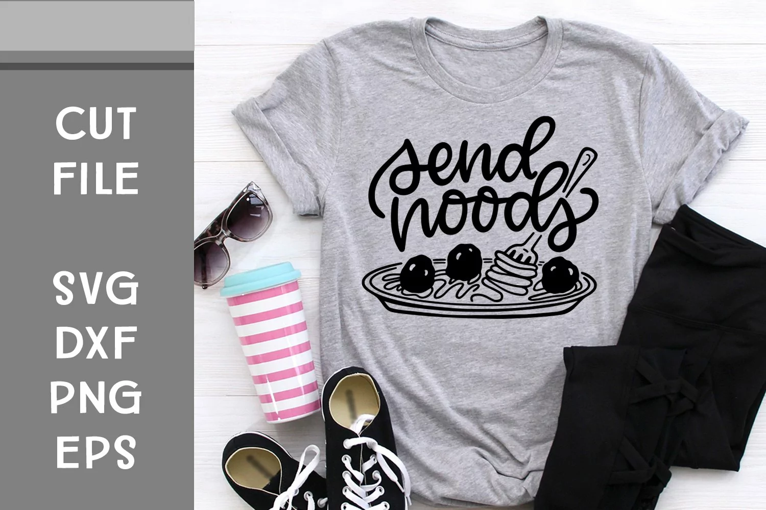 This is a hand lettered cut file. It reads, "Send Noods." With a bowl of spaghetti noodles.