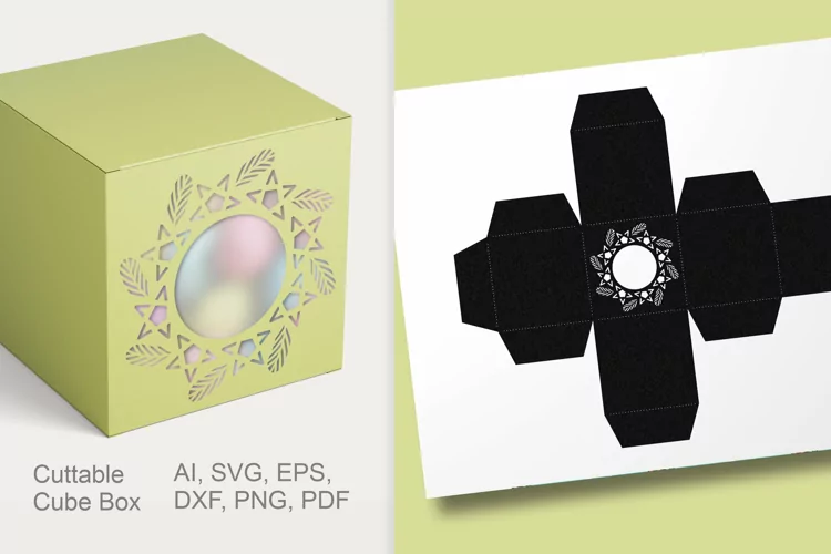 Cuttable cube gift box with window decorated with festive stars shape holes: