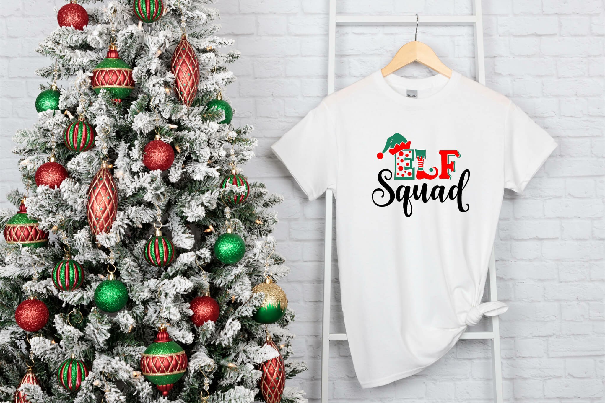 A fun Christmas SVG design that says, "Elf Squad" featuring an elf boot and hat in red and green. This design will work great on t-shirts, bags, stockings, Santa sacks and more!
