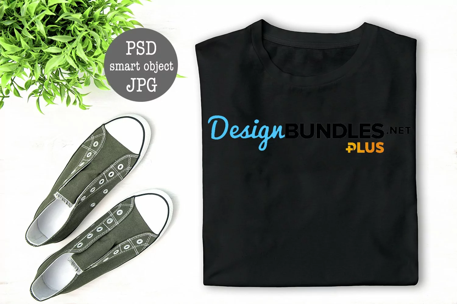 Black folded T-Shirt mock up flat lay with green plant decoration