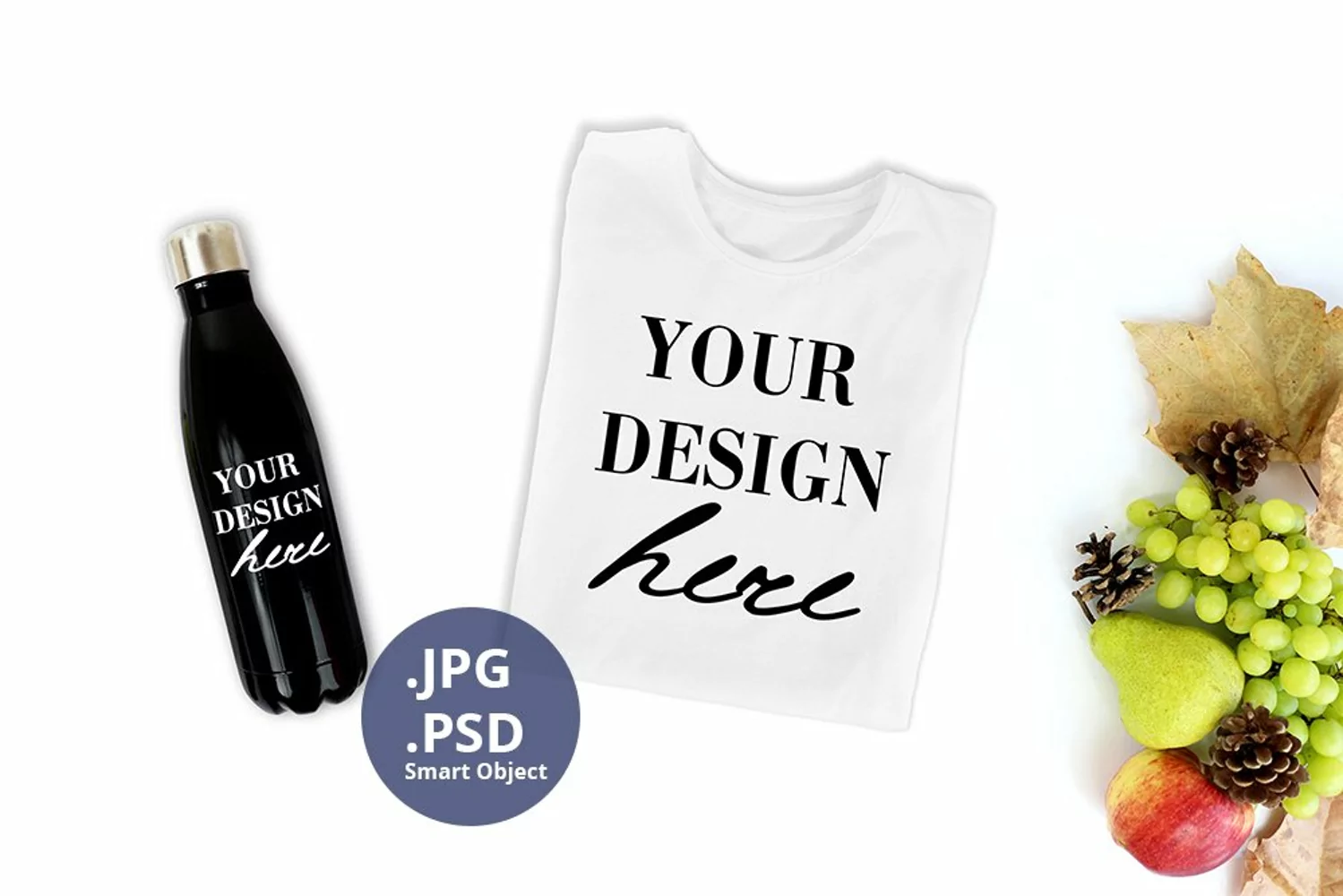 Are you searching for a new Autumn/Thanksgiving mockup for your full-wrap designs? Then this White Tshirt & Bottle mockup could be exactly what you're looking for!