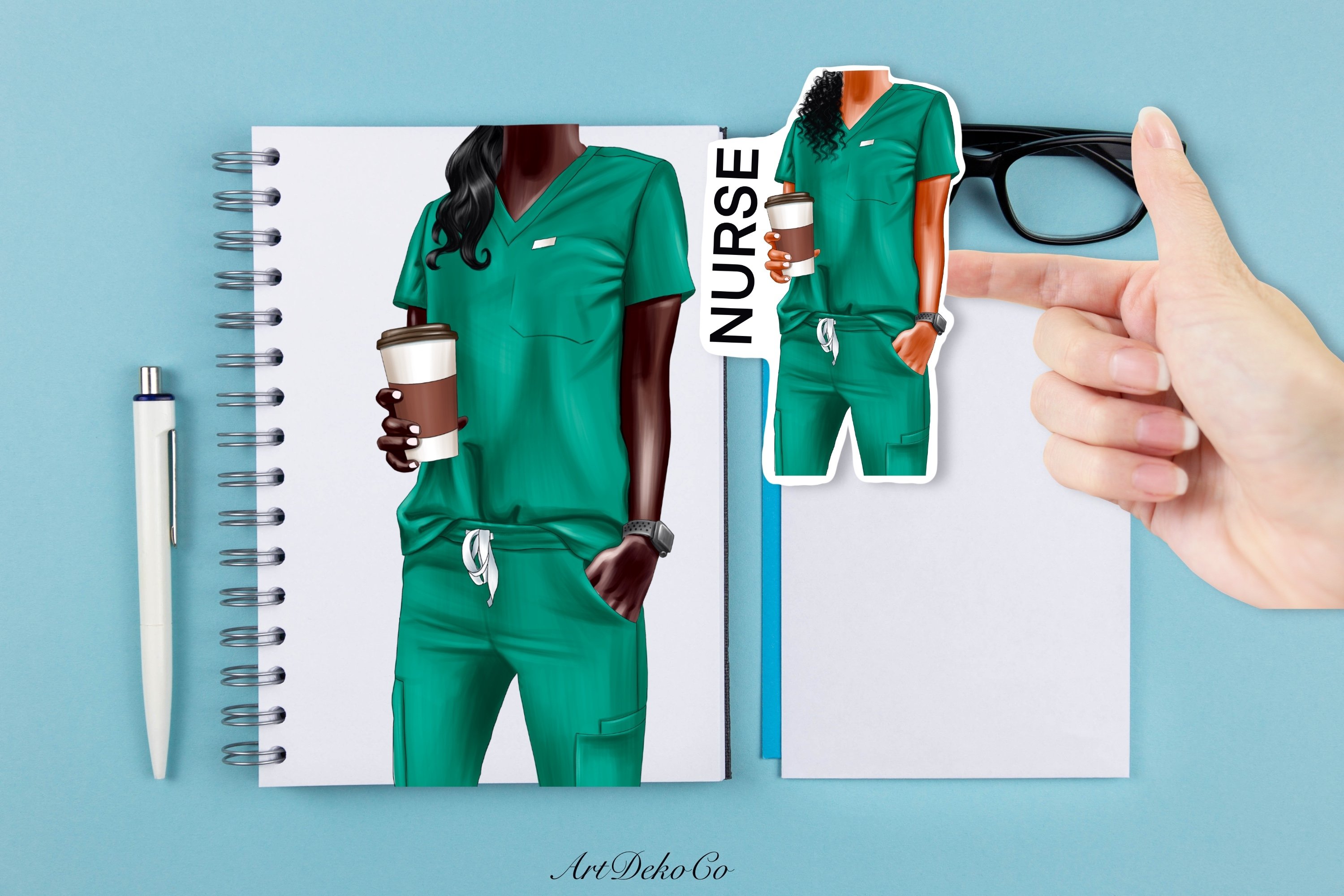 Modern office desk flat lay with empty notebook mockup, white blank card and pen on blue background.