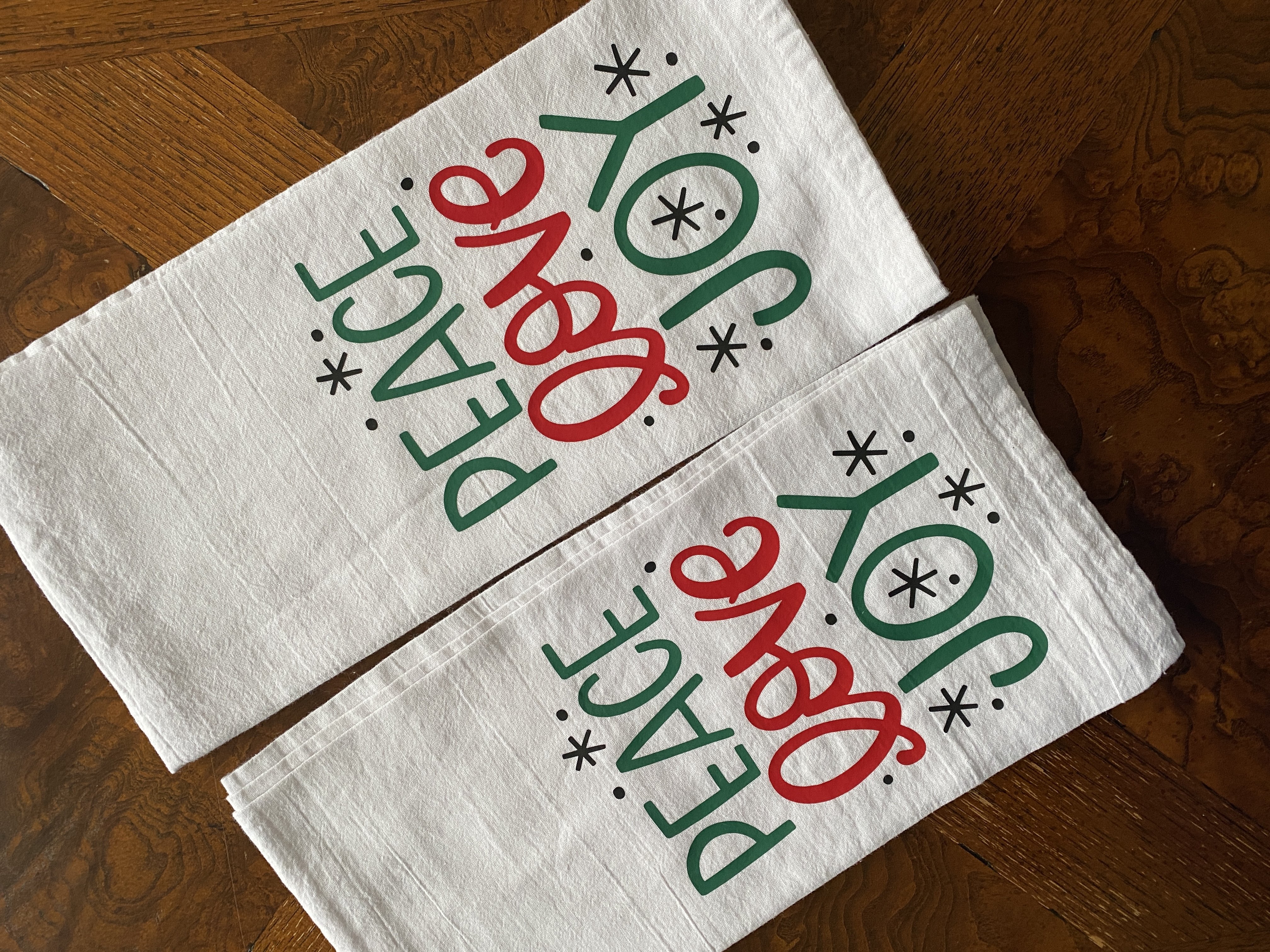 This is a hand lettered cut file. It reads, "Peace Love Joy."