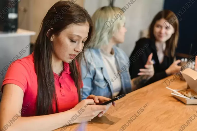 Portrait of Asian woman surfing the internet on the background of girlfriends.