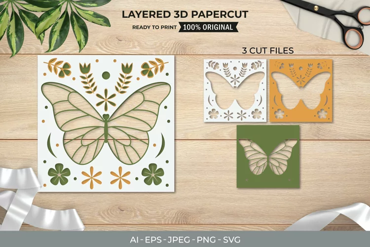 3D Papercut Butterfly Folk Art with Flowers and Leaves Layered