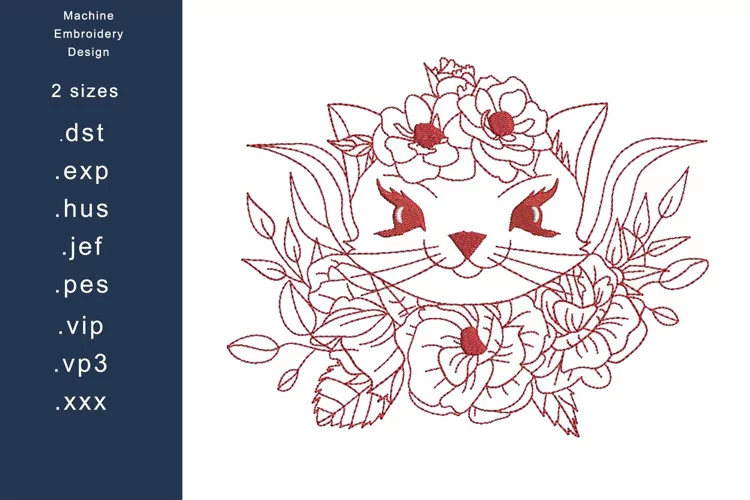 Redwork Cat in Flowers - Machine Embroidery Design 2 sizes
