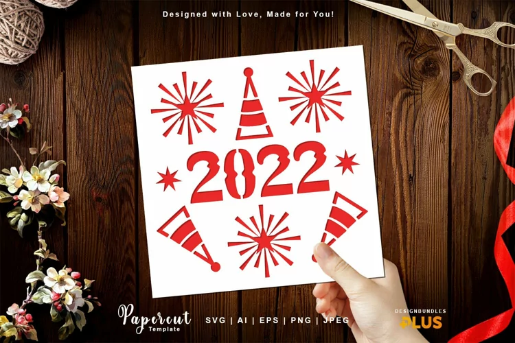 New Year 2022 with Stars and Party Hats, Card Cover Papercut