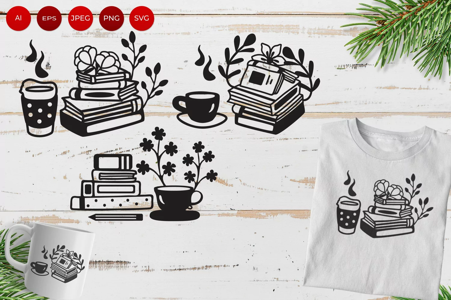 Books and Coffee Cup with Flower for Sublimation Set