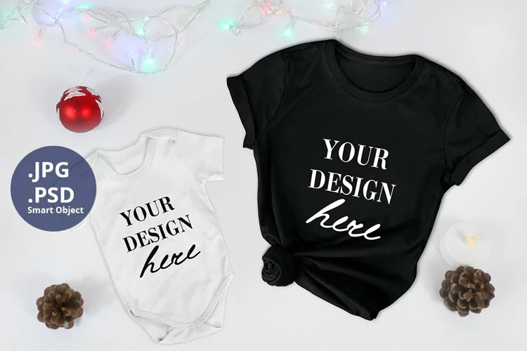 Are you in searching of some awesome PSD mockups for your cool Christmas designs? Then this Black T-shirt and Baby Bodysuit Christmas Mockup could be exactly what you're looking for!