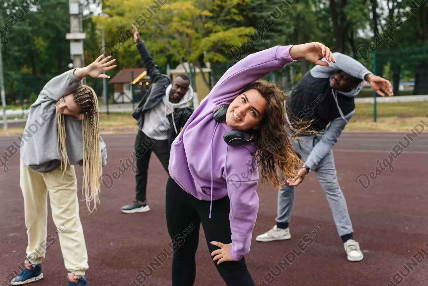A group of people of different nationalities doing exercises. Caucasian woman looking at camera and stretching with friends. Purchase includes 1 image Jpeg