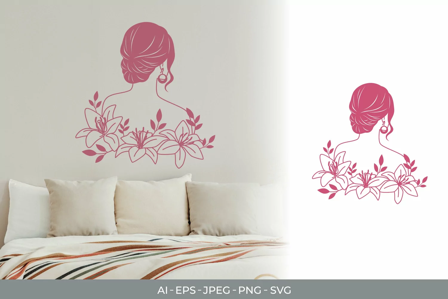 Here we have a design of beautiful woman in back view with lily flowers. You can use it for multiple purposes. You can make it as heat transfer design on T-shirt, tote bag, mugs, pillows, phone case, and other items. You can also print it as small stickers/decals, decorate card cover, print it as in-frame decoration, wall sticker, and more.