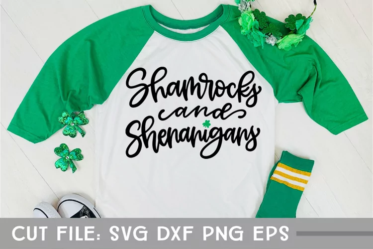 This is a hand lettered cut file. It reads, "Shamrocks and Shenanigans."