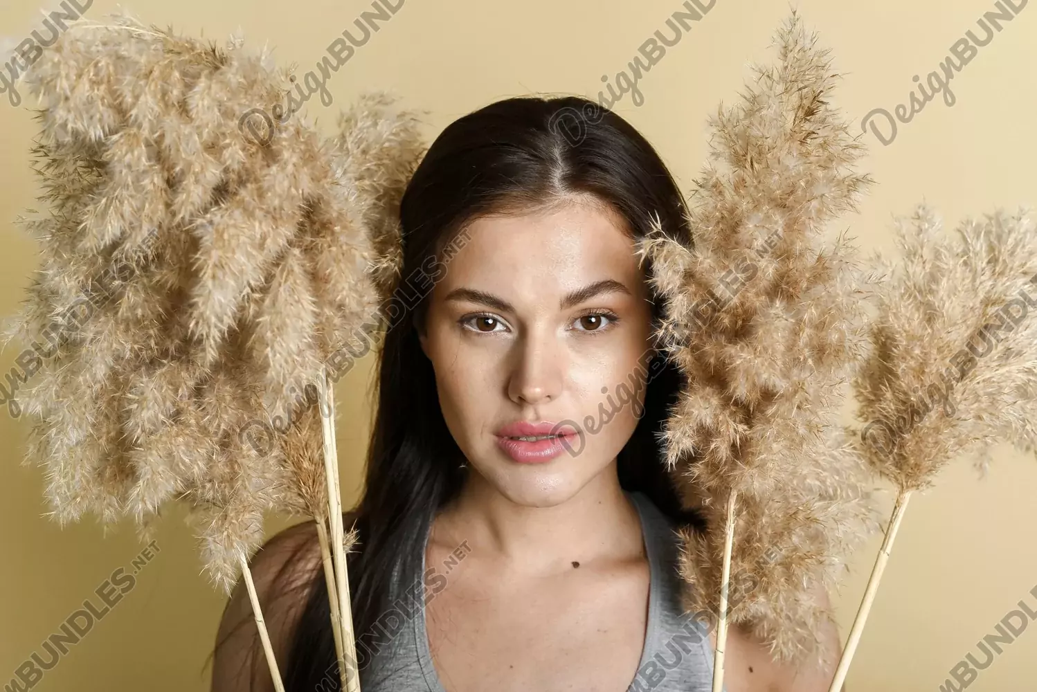Natural cosmetics concept. Woman with dry grass on beige background