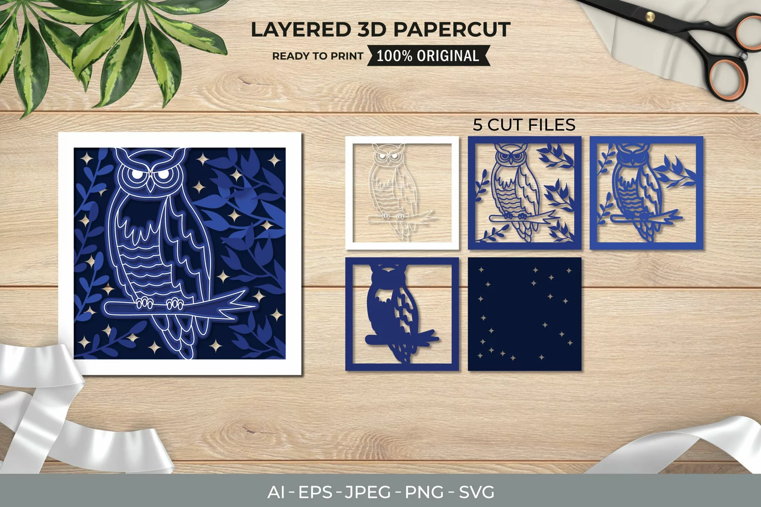 This is a 5-layer papercut design of a brave owl perching on a branch that adorned with leaves and sparkles. This is suitable for children's bedroom, club room, play room decoration, and others.