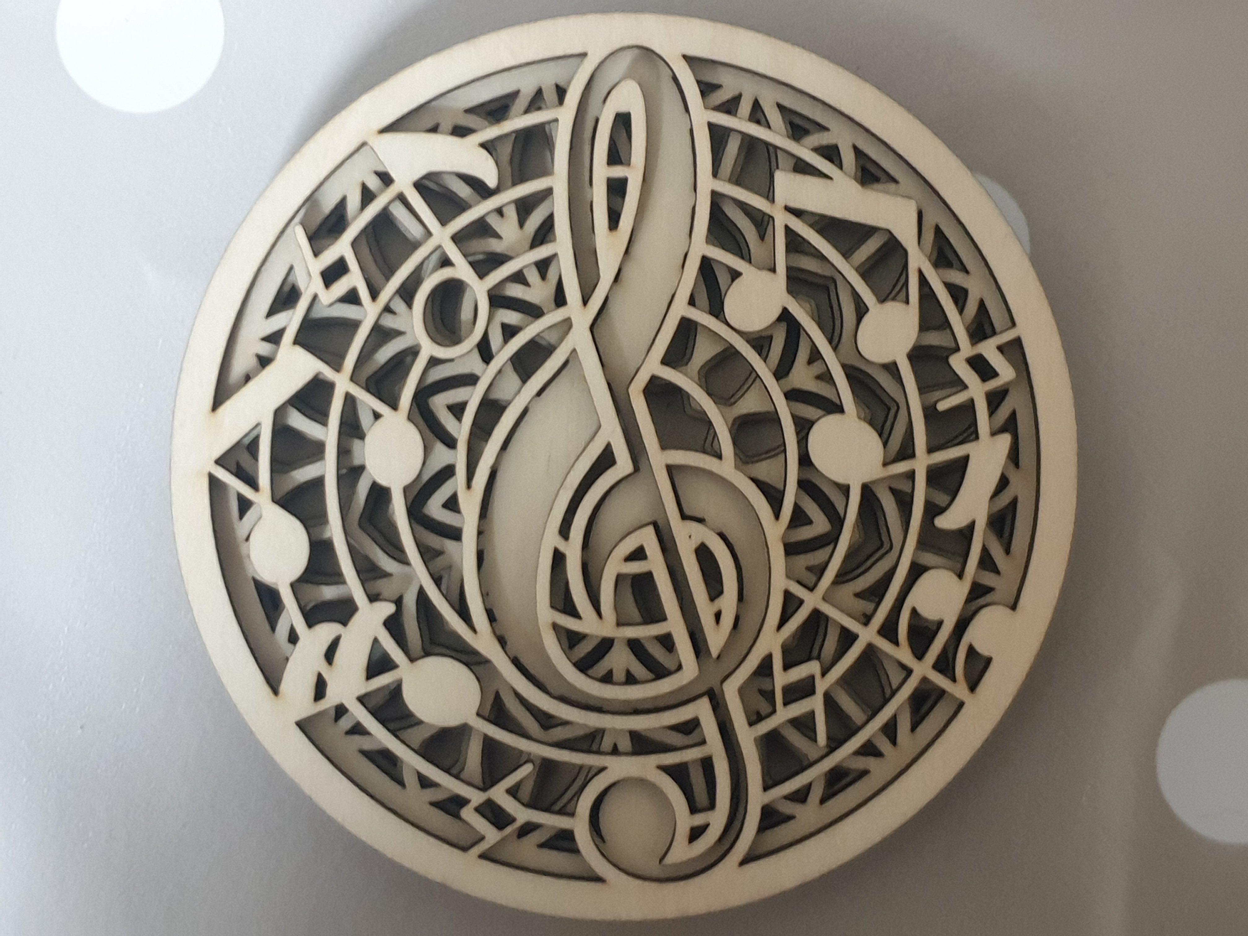 This is a 4-layer circular laser cutting template of treble clef and musical notes with mandala background. It can be used as door sign or inside the building.