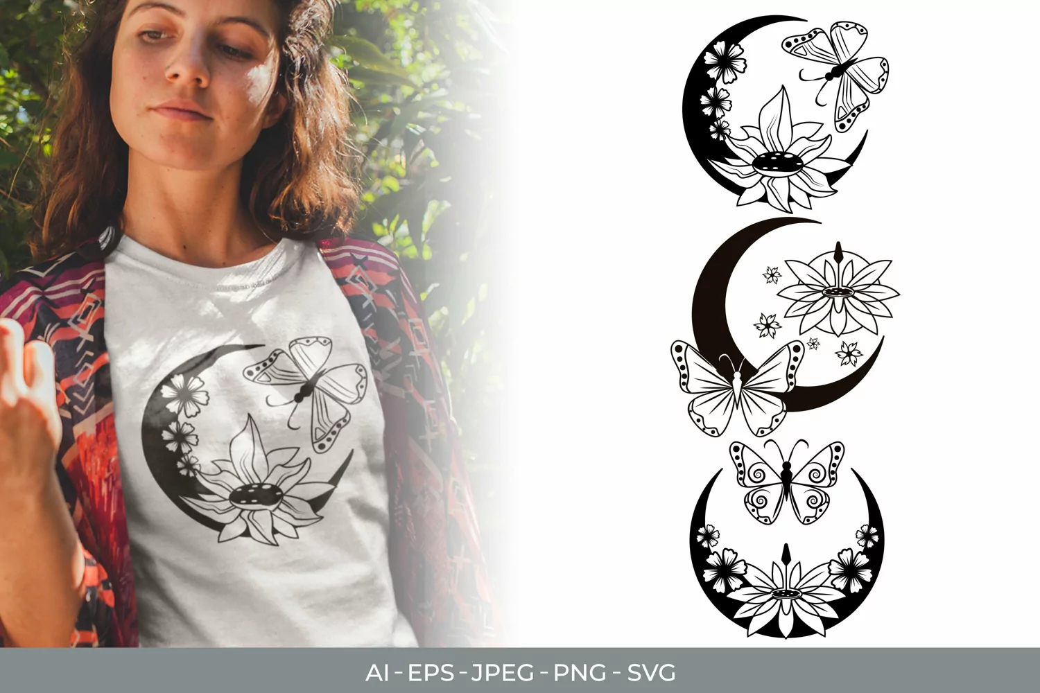 Here we have crescent moon with butterfly and beautiful flowers design. You can make it as heat transfer design on T-shirt, tote bag, mugs, pillows, phone case, and other items. You can also print it as small stickers/decals, decorate card cover, print it as in-frame decoration, window sticker, wall sticker, and more. It will make a great gift for a friend, your family, your parent and someone special.