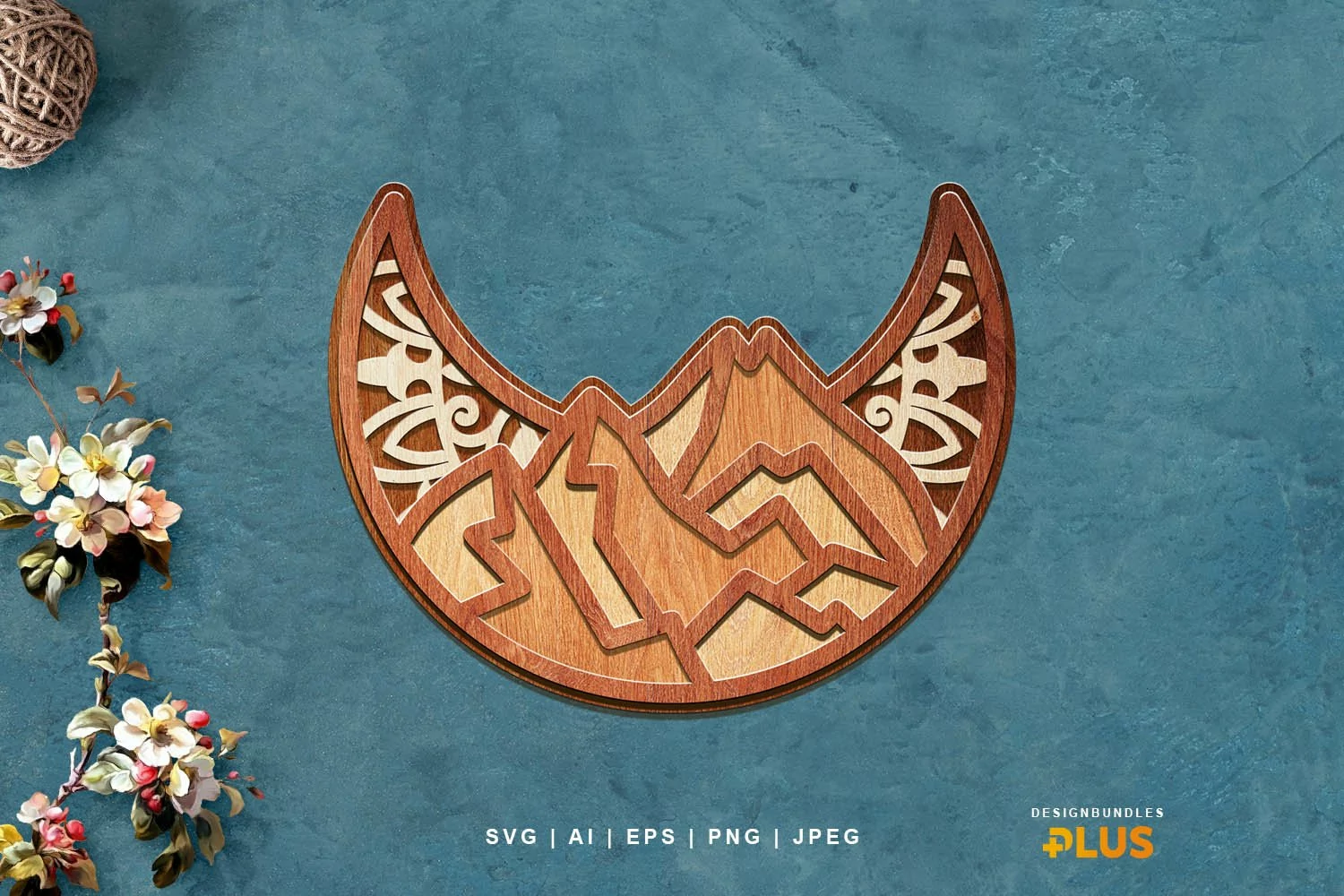 Here we have 5-layer laser cut template of recumbent crescent moon in mandala pattern with mountain decoration on the top of it. This design is suitable for living room, club room, reading room, dining room, decoration in office, hotel room, and others. You can use it as hanging decoration. It will make a great gift for a friend, your family, your parent and someone special.