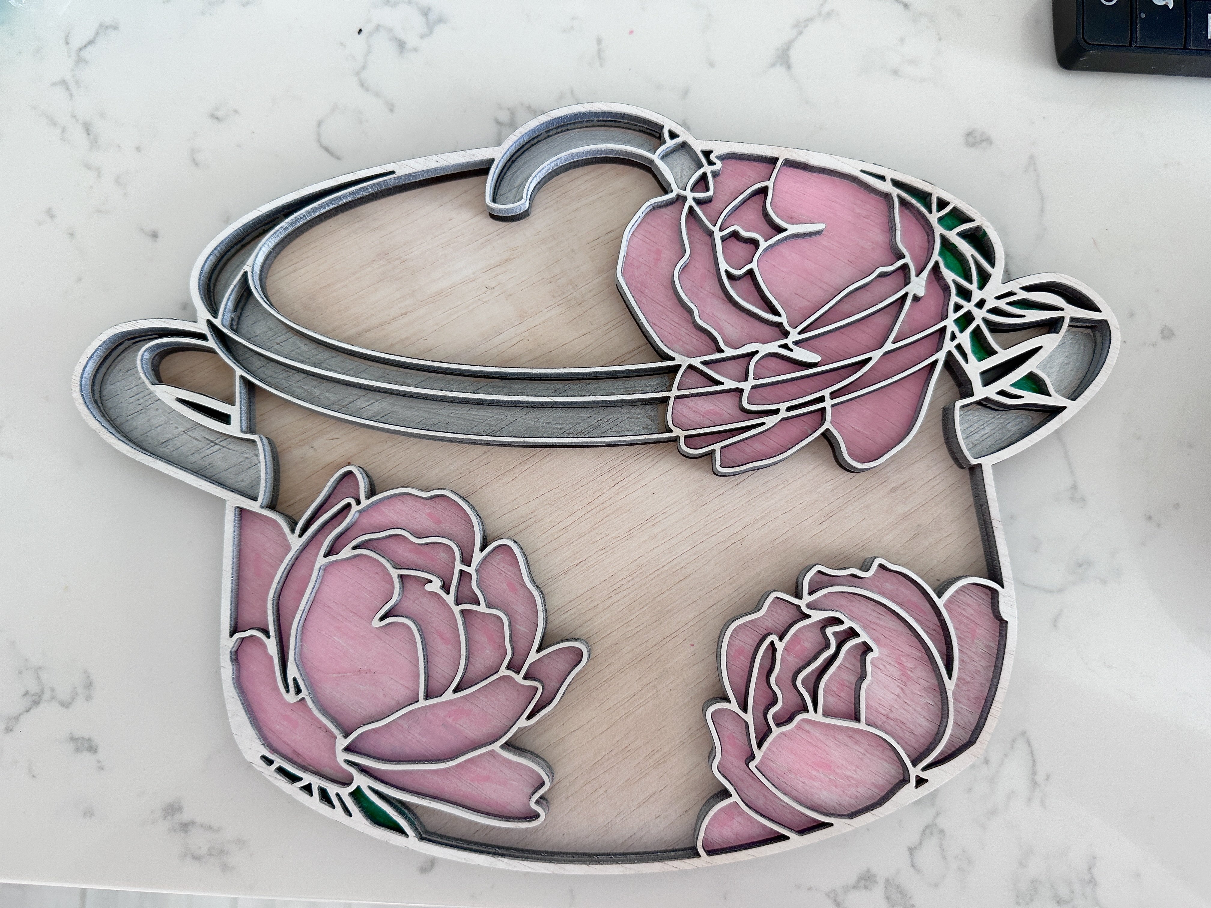 You can easily increase the size of this design, but please consider thin elements if you're reducing it. If you are planning on painting the layers- do so before gluing them together.