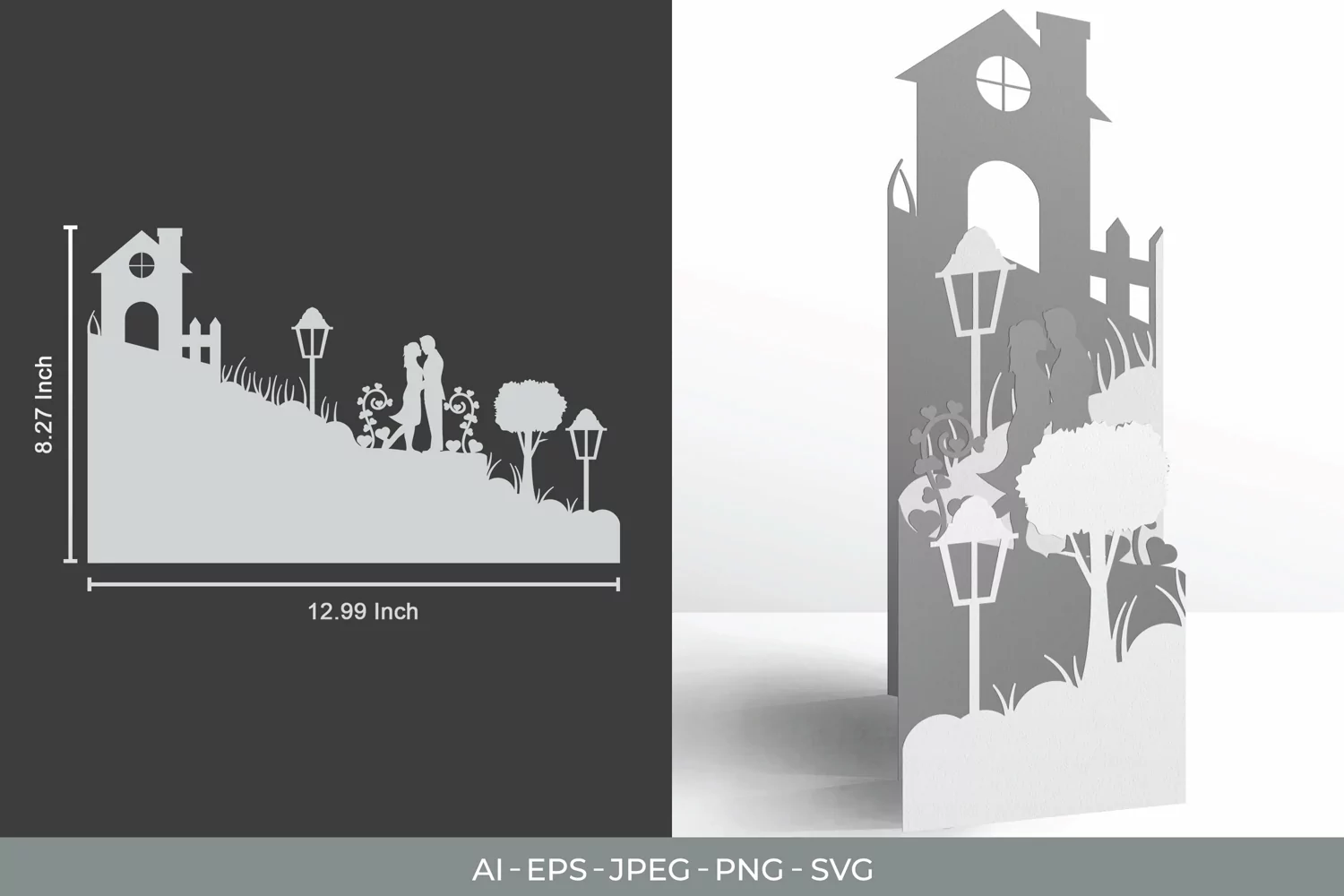 Here we have a folding papercut template of a little house with romantic couple. This is suitable for bedroom, dining room, living room decoration, and others.