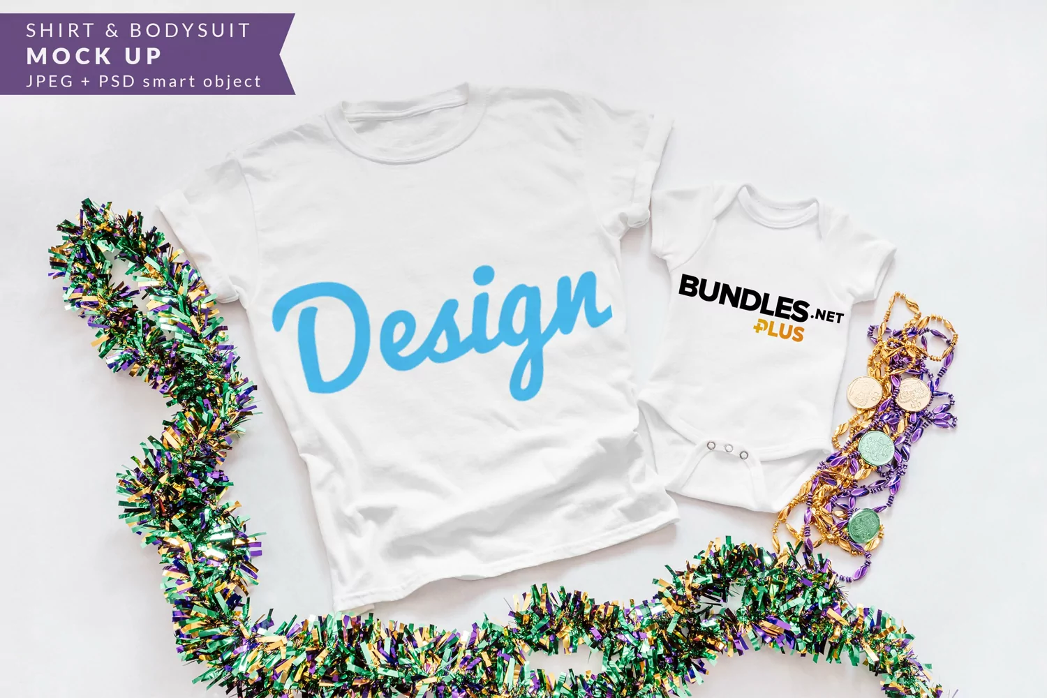 White Shirt and Baby Bodysuit | Mardi Gras Mock up