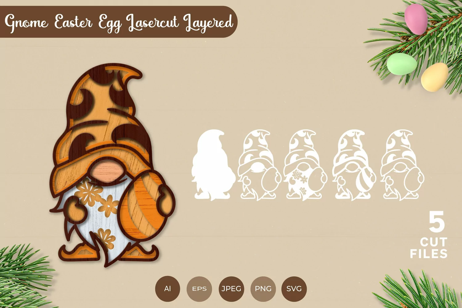 This is a 5-layer laser cutting template of a gnome holding an Easter egg..