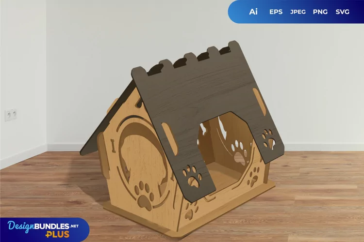 This is a 3D laser cutting template of a dog house with cutouts of dog head on each side and ornamentations of paw print and bones.
