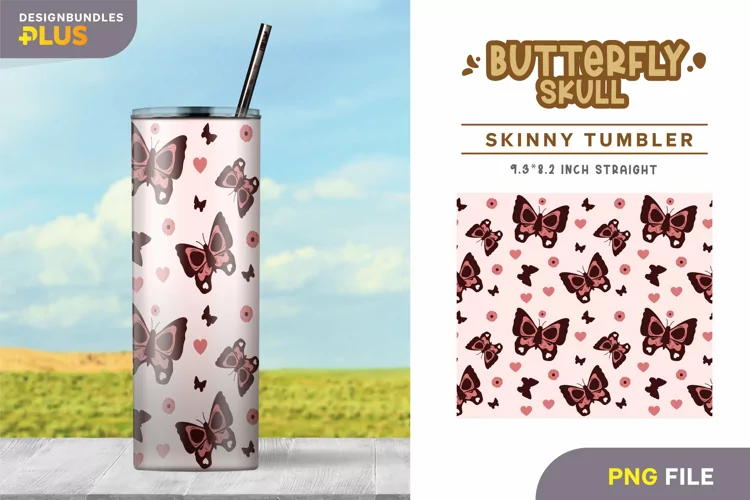 This is a seamless template of butterfly skull with smaller hearts and butterflies on pink background. It is intended for 20 oz. tumbler. Not all tumblers are the same size, so be sure to check the dimensions.