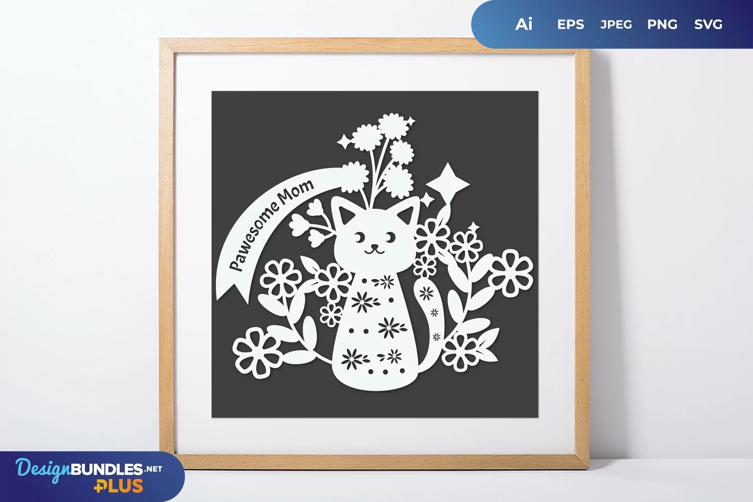 This is a square papercut design of cat with floral ornaments and "Pawesome Mom" text, perfect for cat moms.