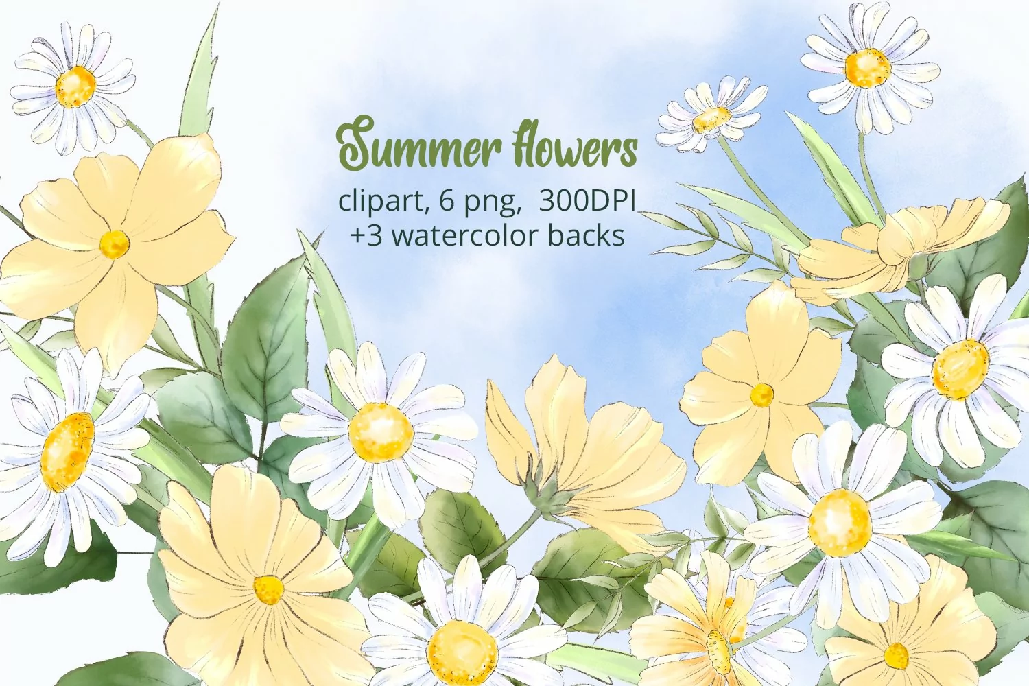You'll get 6 PNG files with chamomiles bouquets and 3 watercolor backgrounds.