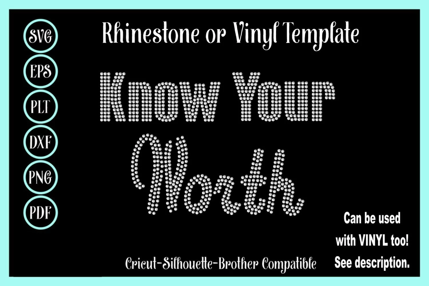 Rhinestone digital downloads are the perfect way to grow your design base and offer your clients on trend, as well as beautiful and classic designs. This rhinestone instant download template includes the following formats: SVG, EPS, DXF, PLT, and PNG, ensuring it is compatible with a wide variety of cutting software and machines, including the Silhouette, Cricut, and Brother software.