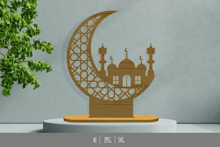 This is a laser cutting template of a patterned crescent moon and a mosque. This design consists of a standing template and a base template with 1 slot. It is recommended for 0.125 inch of board thickness.