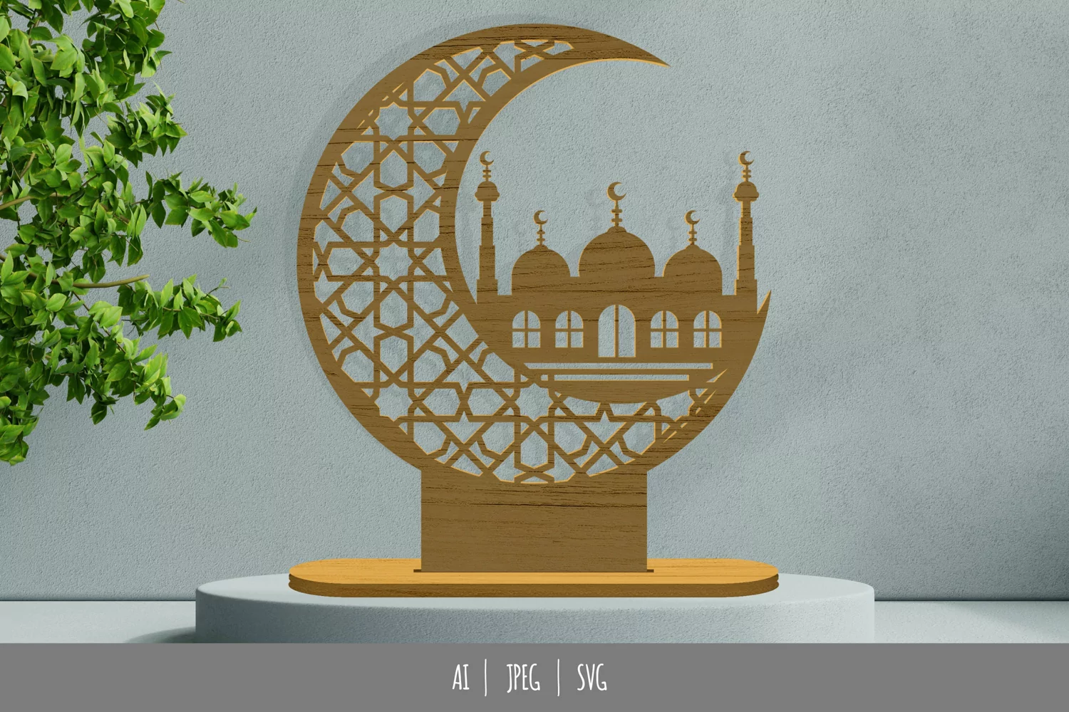 This is a laser cutting template of Islamic patterned crescent moon and a mosque. This design consists of a standing template and a base template with 1 slot. It is recommended for 0.125 inch of board thickness.