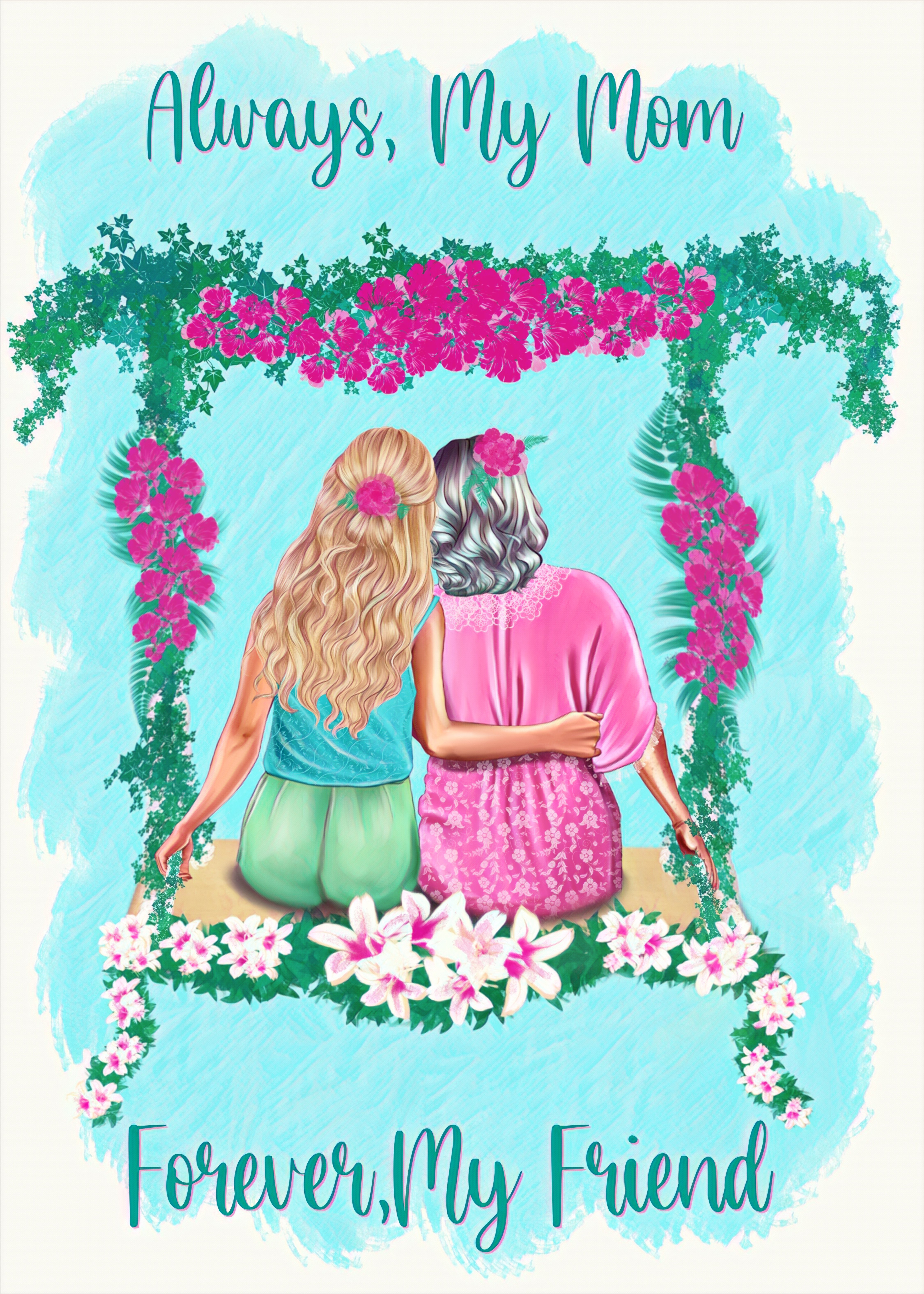 Mom and adult daughter are standing side by side, rear view.Family clipart