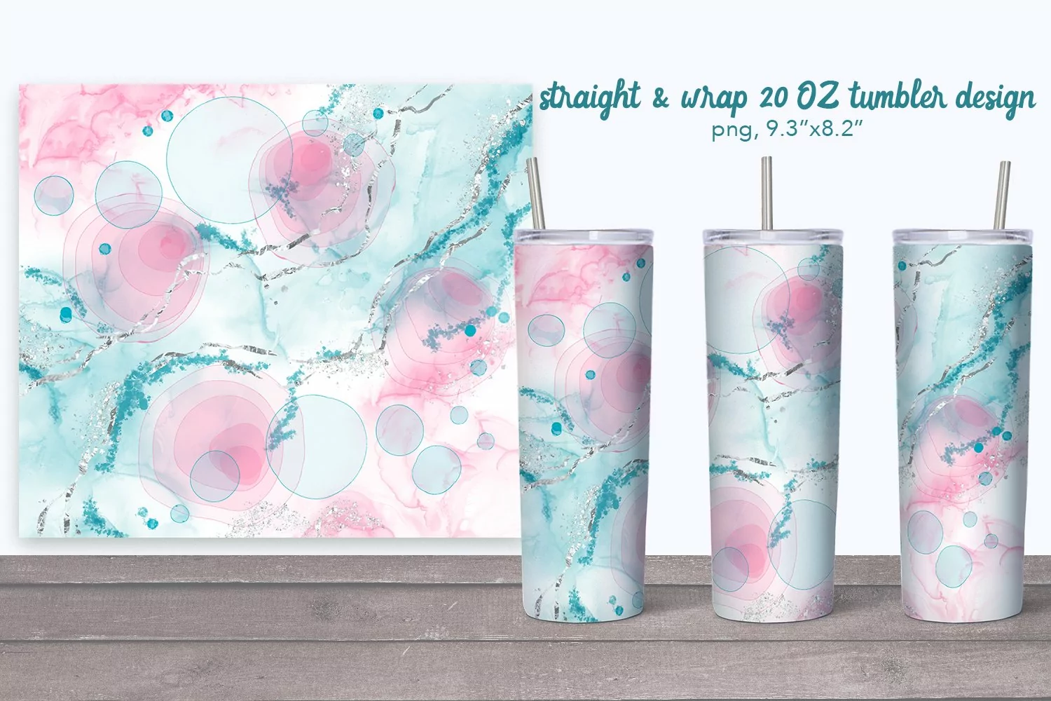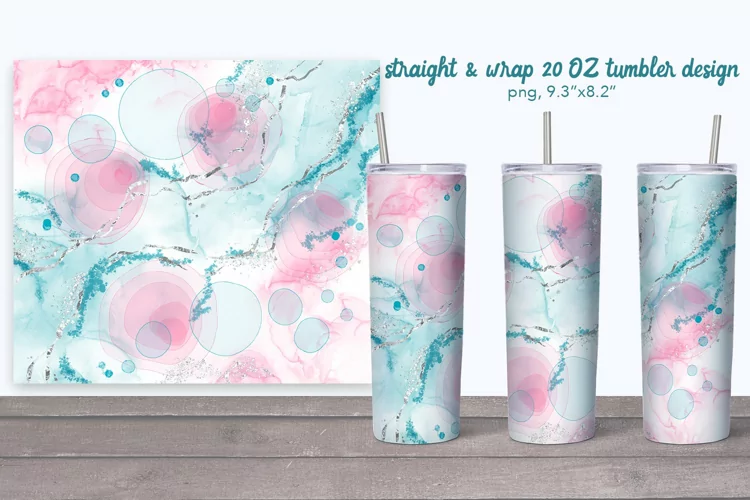 Light pink and cyan tumbler with silver. Alcohol ink Tumbler. Abstract sublimation