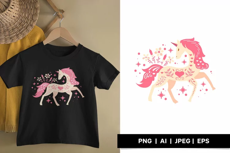 Do you believe in magical creatures? This is template of cute standing pink magical unicorn with botanical motif on its body, decorated with sparkles, flowers, and cattails.
