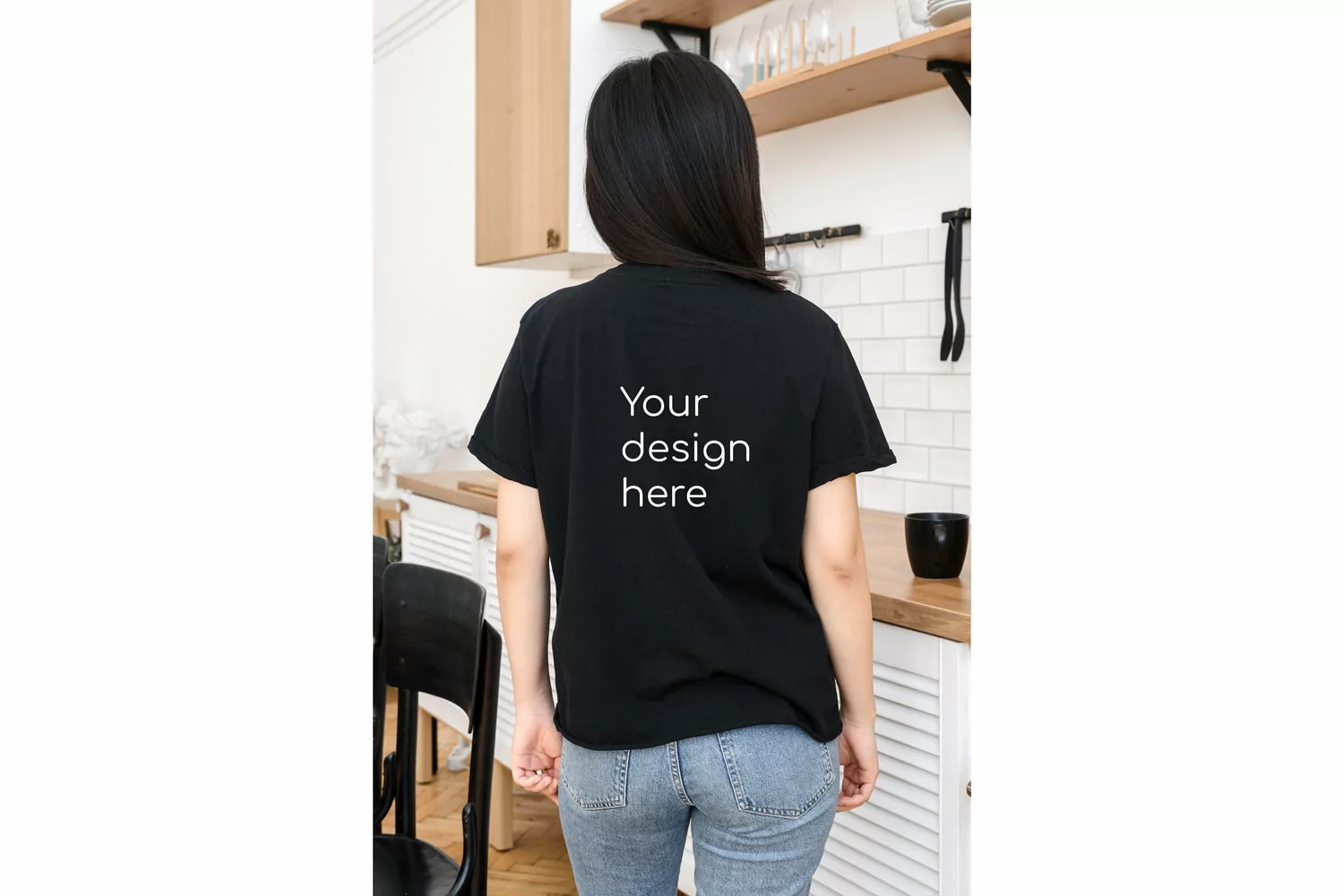Asian woman with blank black t-shirt in home interior