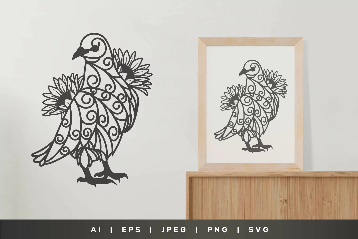 This is a template of a dove with swirl motif and sunflowers.