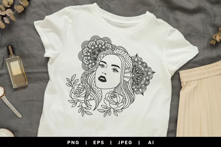 Do you believe in mythical creatures? This is a template of beautiful mermaid face with patterned hair, roses, and a series of ornate mandalas.