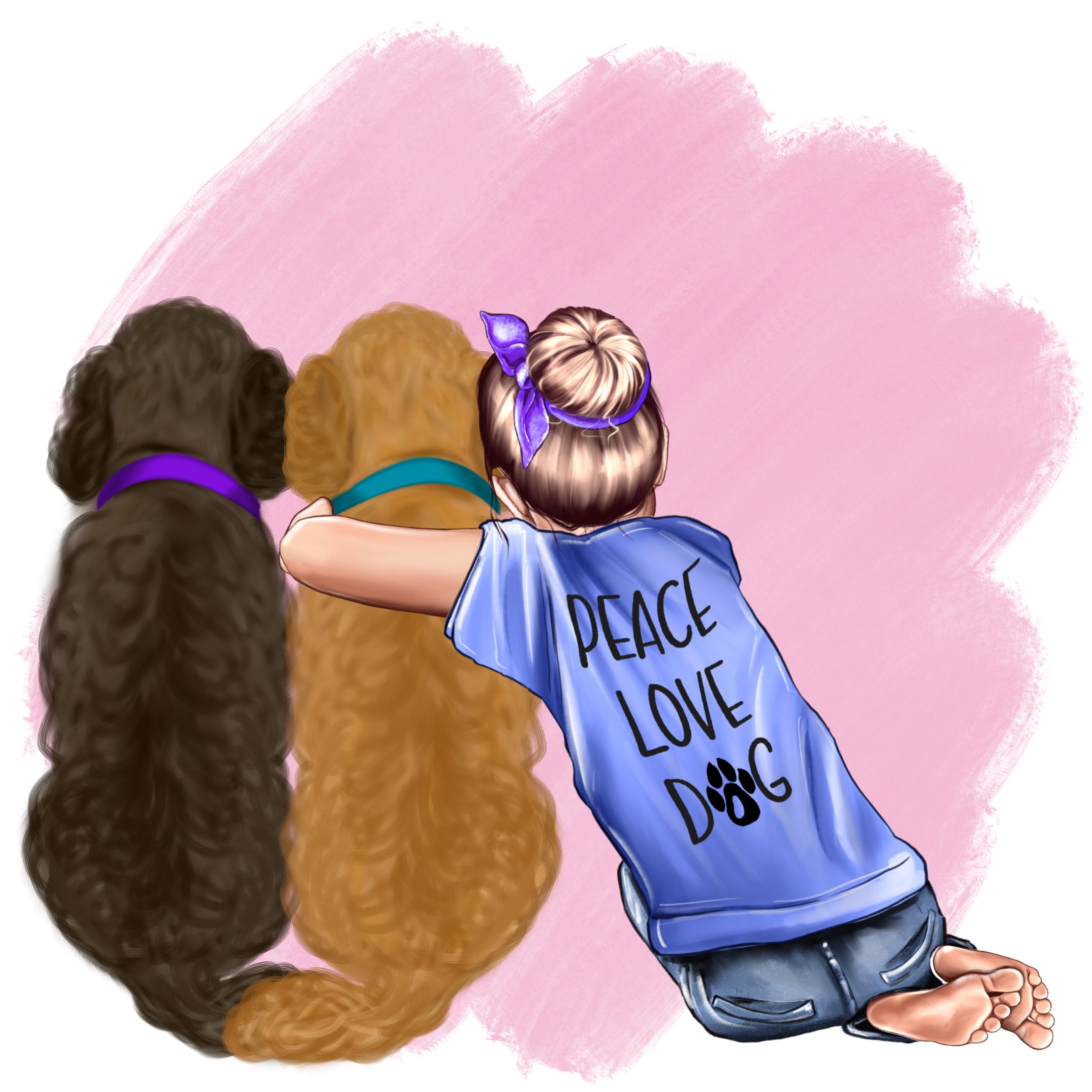 A girl hugs a dog, rear view.Love my dog. Dogs of the breed Labrador, Dalmatian, Husky, St. Bernard, German Shepherd and others..