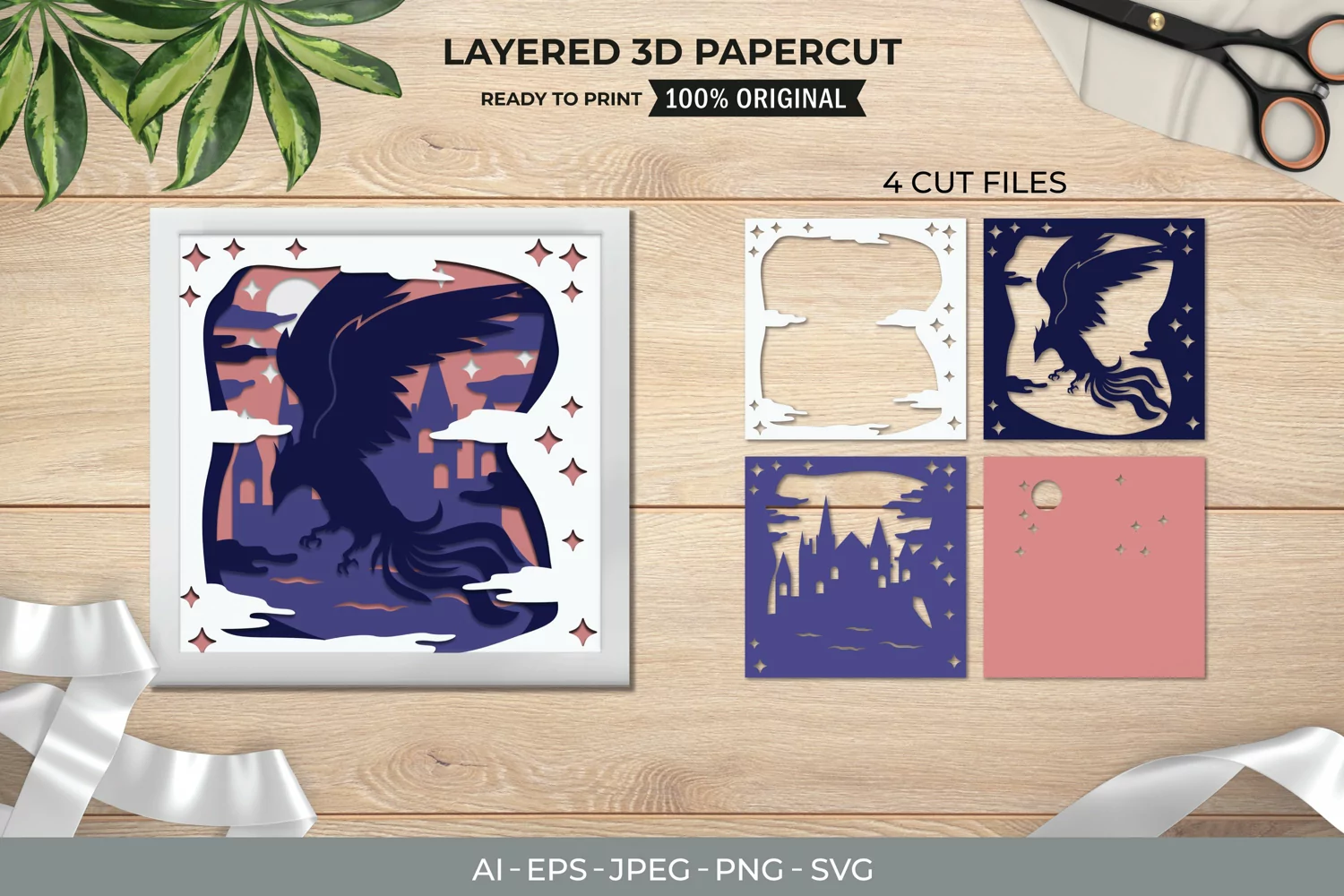 Do you believe in mythical creatures? This is a 4-layer, square papercut of a flying phoenix under shining full moon with mountains at the background .