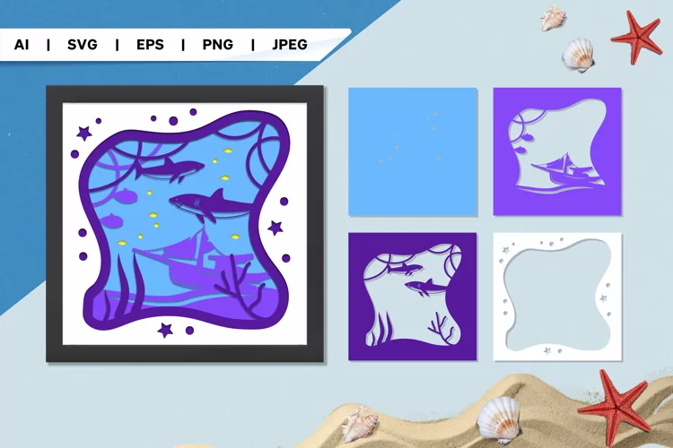 This is a 4-layer papercut design of underwater scenery with sharks, fish, and sunken ship. This is suitable for bedroom, club room, playroom, dining room, study room, living room, souvenir shop, restaurant, library decoration, and others.