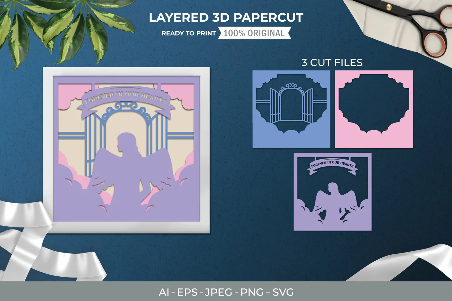 This is a 3-layer square papercut design of Memorial, Forever In Our Hearts, Winged Woman 3D Papercut. It can be used to decorate funeral home, churches, your house, and others. It will make a great gift for a friend, your family, your parent and someone special.