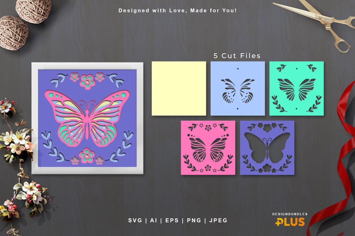 Do you believe in fairies? This is a 5-layer, square papercut of a folk art butterflies design. The outer cutout is designed in the shape of a butterfly.