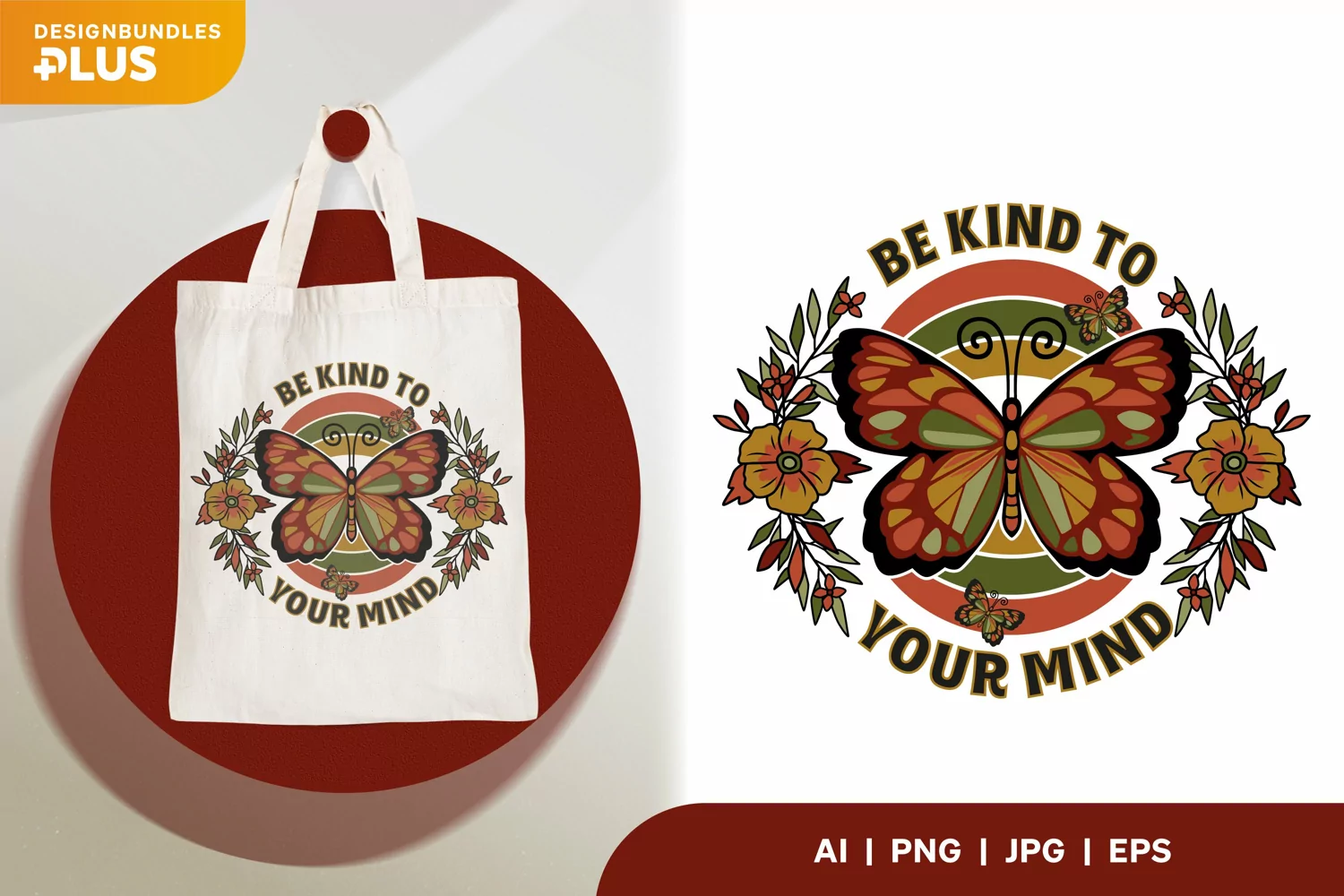 This is a template of "Be Kind To Your Mind" text with an illustration of butterfly and flowers in retro color. You can make it as heat transfer design on T-shirt, tote bag, mugs, pillows, phone case, and other items. You can also print it as small stickers, decorate card cover, in-frame decoration and more. It will make a great gift for a friend, your family, your parent and someone special.