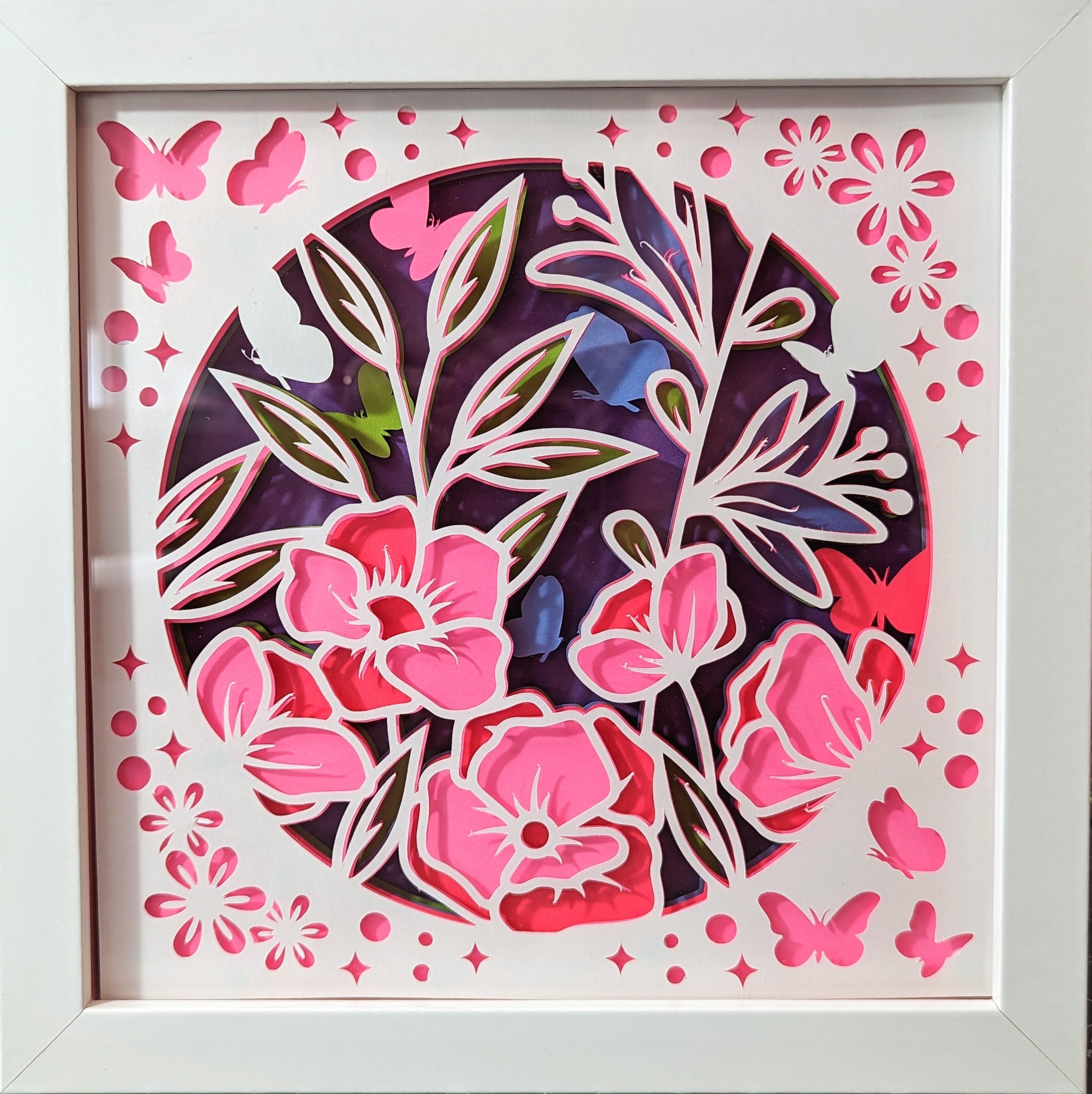 This is a 6-layer, square paper cutting template of flower garden, with butterflies on the outer frame.