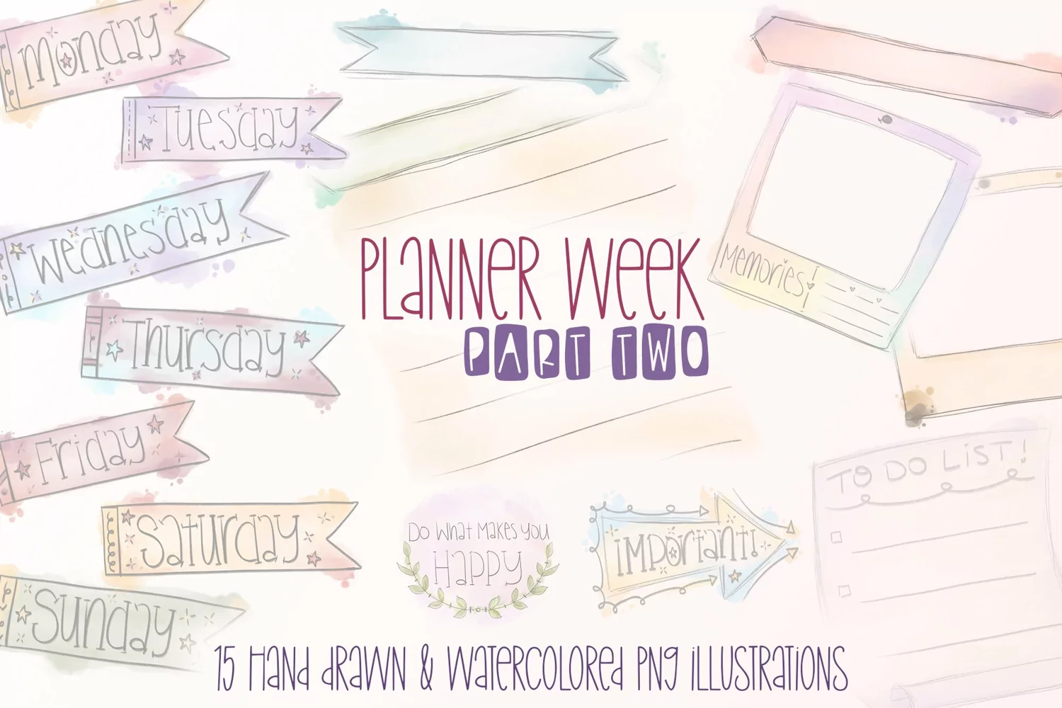 Included: 15 PNG weekly planner clipart which includes already premade watercolor options for your enjoyment!