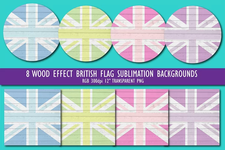 This bundle of sublimations includes 8 different pastel coloured round and square British flag shapes with a wood effect texture.