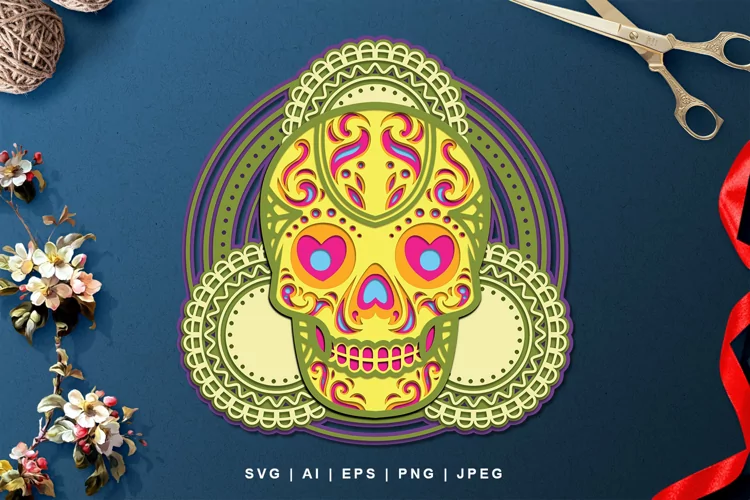 Here we have a 9-layer papercut design of pretty sugar skull with heart eyes, on the top of 3 decorative circles.