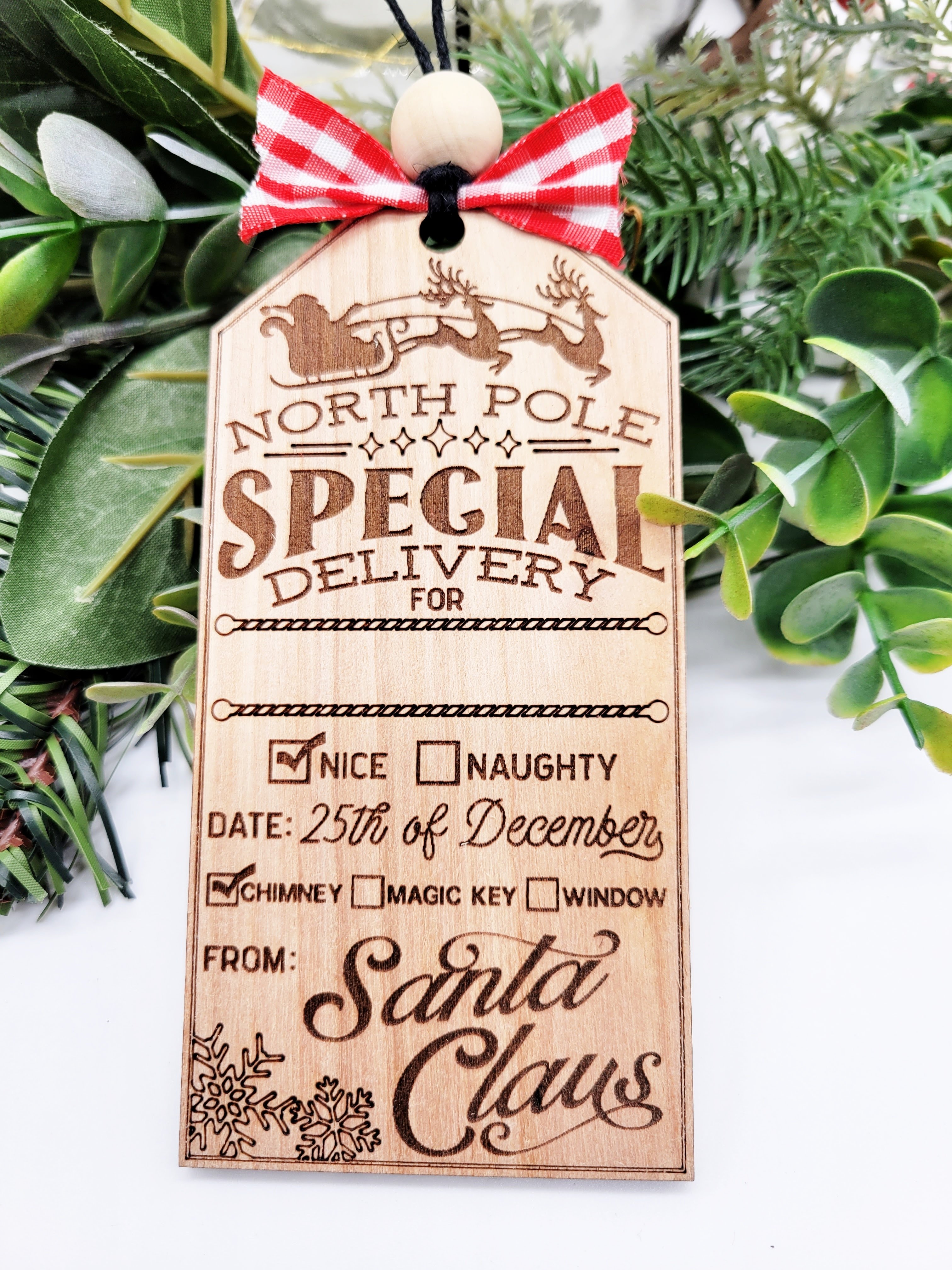 Here we have Christmas gift tag template of "North Pole Special Delivery" text. It will be a great addition to your gifts be it for a friend, your family, your parent and someone special.