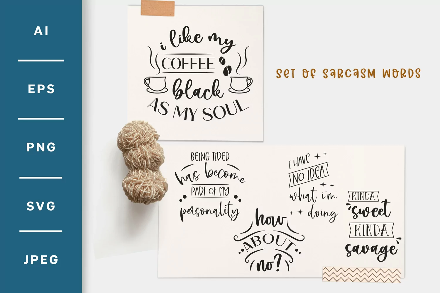 Here we have a set template of funny and sarcastic quote letterings. The texts are: